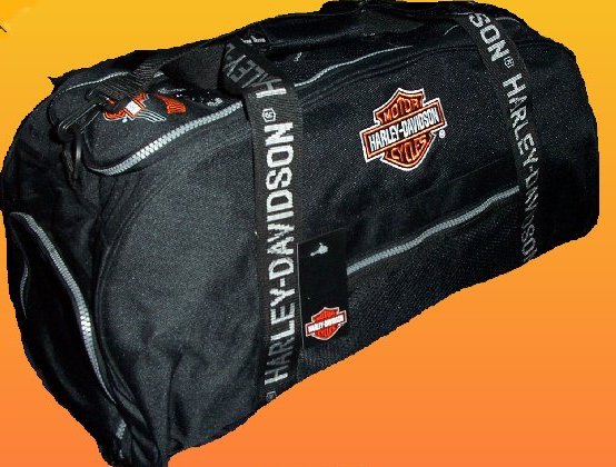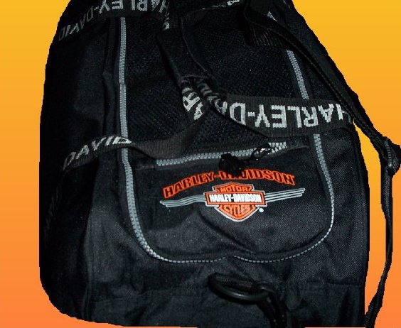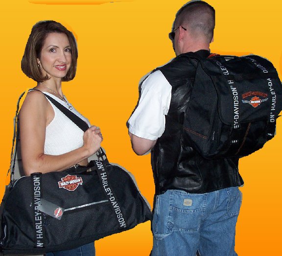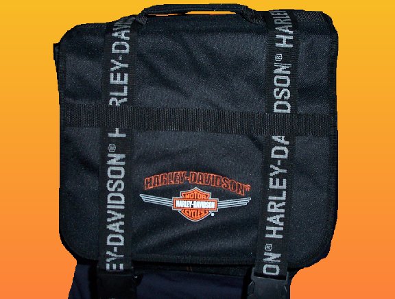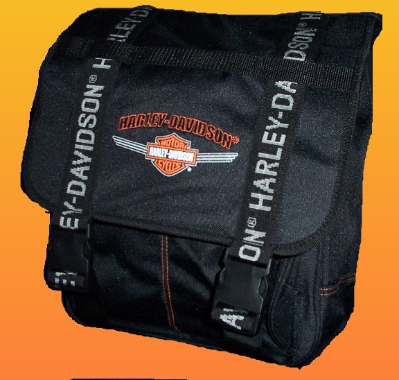 Harley-Davidson logos and Harley-Davidson stitched into straps to boldly display